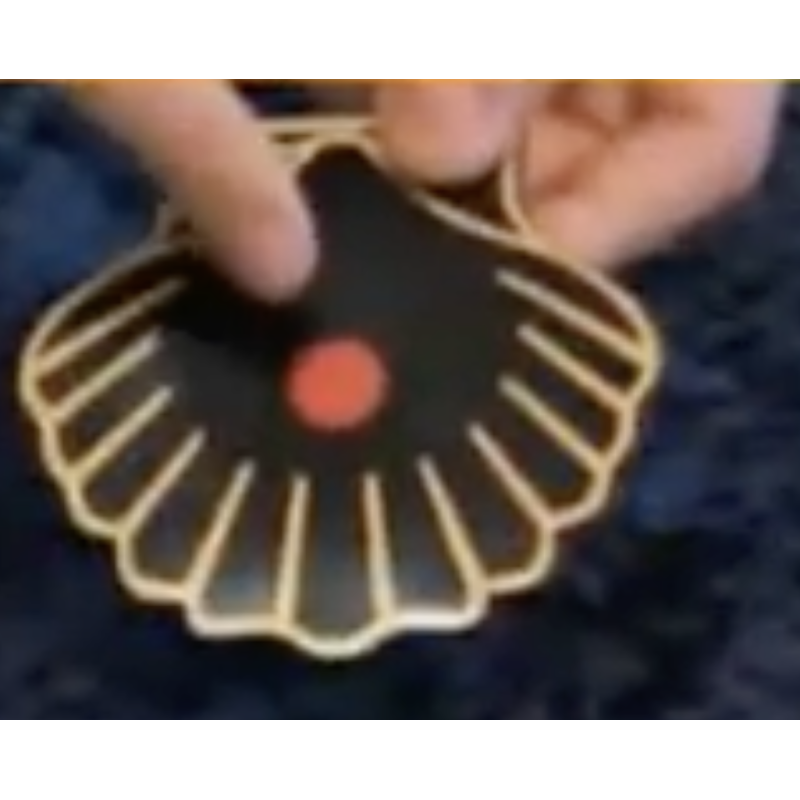Le magicien présente au public un coquillage doré dans lequel on aperçoit une « perle » blanche.