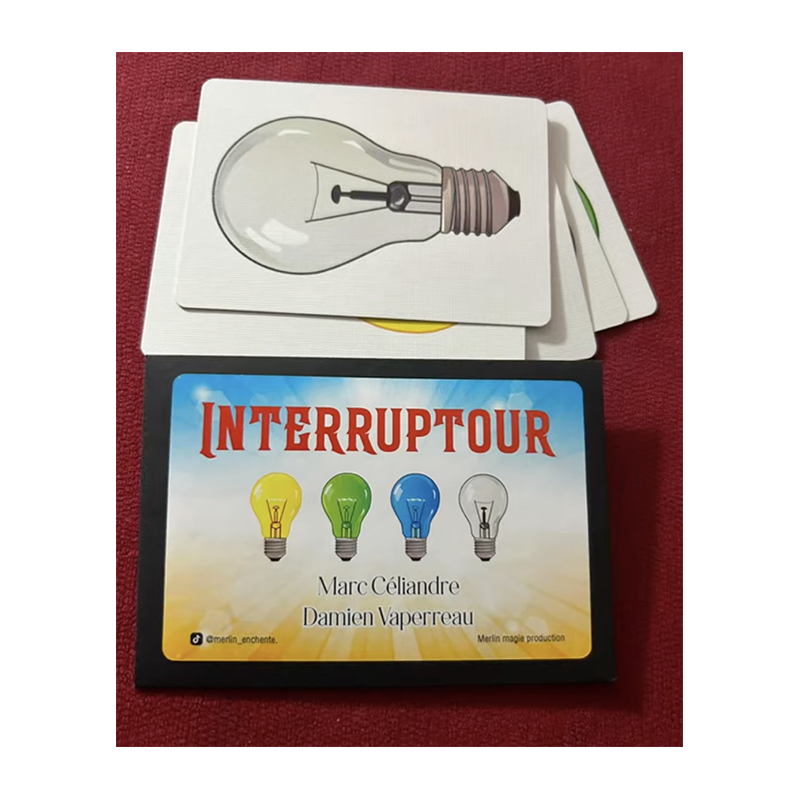 Avec Interruptour, vous allez emmener votre spectateur dans un monde rempli d’une logique implacable. Vous présentez des cartes avec, dessinées dessus, une ampoule éteinte ains qu’une carte avec un interrupteur à trois positions : couleur bleue, OFF, couleur jaune.